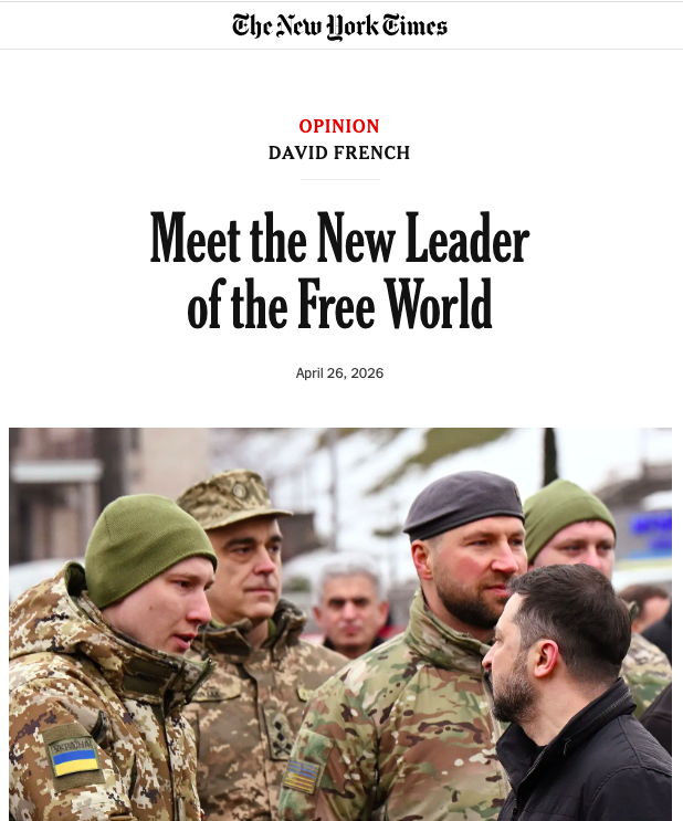 No nation can match American might, but for the first time in my adult life, the moral and strategic heart of the defense of liberal democracy doesn’t beat in Washington. It doesn’t beat in London or Paris or Berlin or Ottawa, either. It’s in Kyiv, where a courageous leader and a courageous people have picked up the torch America has dropped.