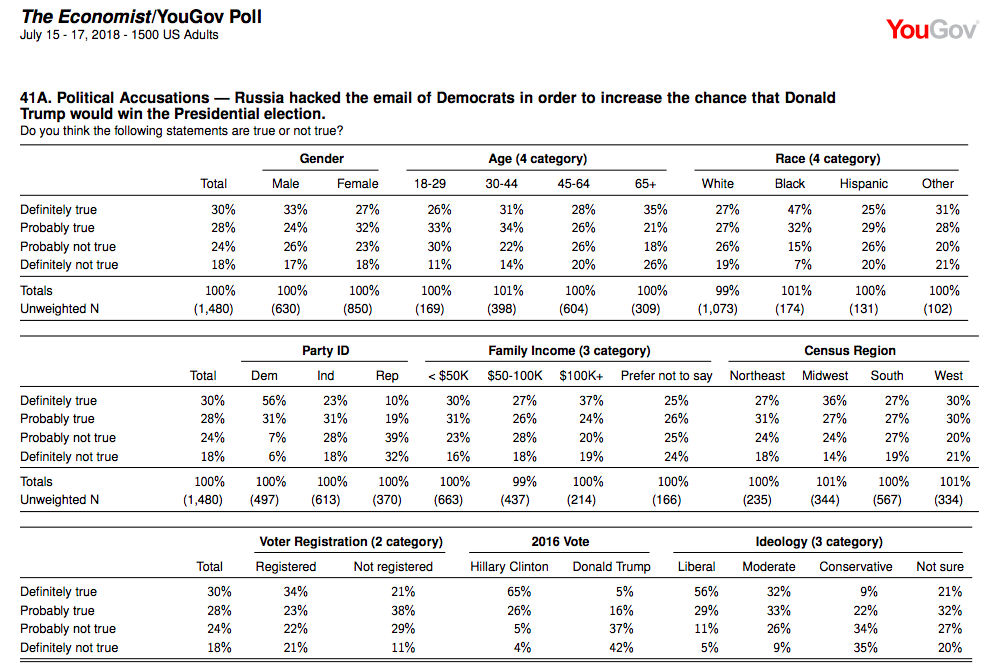 У меня есть подозрение, что если этой части электората задать вопрос "На встрече Президент РФ предложил выдать России бывшего Секретаря Клинтон для суда по обвинениям в убийстве в г. Бенгази в 2012 году посла США в Ливии. Вы поддерживаете такую выдачу?", то результаты были бы примерно такими же -- процентов 80 поддержало бы.